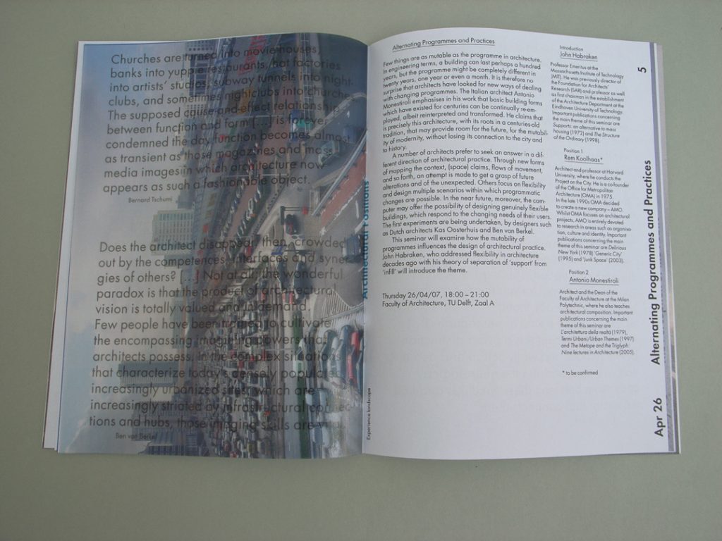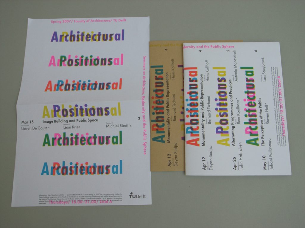 The faculty of architecture at the TU Delft commissioned Karel Martens to design booklets, flyers, stationery, and a poster for their series of six seminars this spring on ‘Architecture, Modernity and the Public Sphere’. Martens, working in collaboration with his daughter Aagje Martens, took up the implications of the title ‘Architectural Positions’, and the need to make flyers and booklets for the six occasions and for the series as a whole, but on a small budget. Just three printing plates were used for the colour printing, each containing two of the pieces; colour (cyan, magenta, yellow) was changed three times. In this way six different combinations or ‘positions’ were obtained. The black text is stable and clear. This patterning is enacted again in the website for the series. Not for the first time with this designer, the restrictions were embraced, with maximum effect.
