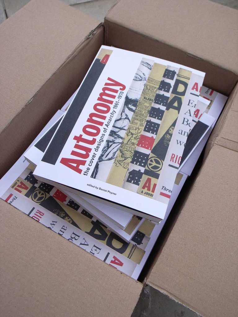 Some finished copies of our next book, Autonomy: the cover designs of ‘Anarchy’ 1961–1970 were delivered to the office this morning. This is the culmination of several years of work by the book’s editor Daniel Poyner; he was joined by designer Peter Brawne and sub-editor Robin Kinross to form a group of three people who made the final book. The result feels like a very solid (820 gm) and well-manufactured contribution to graphic and political culture. It has been printed by Die Keure in Bruges and bound by Hexspoor at Boxtel in the Netherlands, using the Otabind process with cold glue. The book stays flat at every opening: essential for the central sections of the book in which we show back-and-front covers of all 118 issues of the journal as double-page spreads. Autonomy will be published formally on 15 November. It should put in its first public appearance tomorrow at the Anarchist Bookfair in London (go to the stands of Housmans Bookshop and Freedom Press).