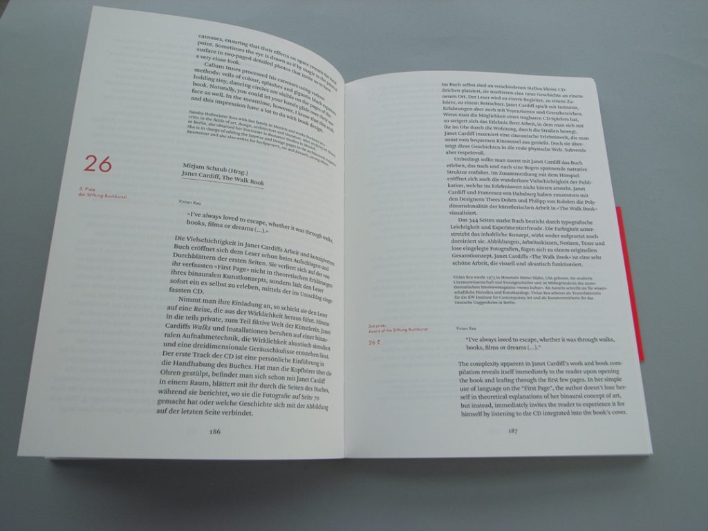 The latest German catalogue is quite a bit thicker than usual, and it is less illustrated than in recent years. Covers of the chosen books are shown in colour, at the front of the catalogue, and inside spreads are shown in small black & white photos, printed on a grey paper towards the back. But the main work of representation is done in words, in short essays by a team of commentators (writers, designers, publishers). Uta Schneider, for the Stiftung Buchkunst, explains the idea: since representation is never quite possible, and so is always unsatisfactory, then why not take another way and use words to describe these books? After all, this is what books are all about: words, writing, reading, imagination. This idea comes from the principal designer of the book, Bernd Kuchenbeiser.