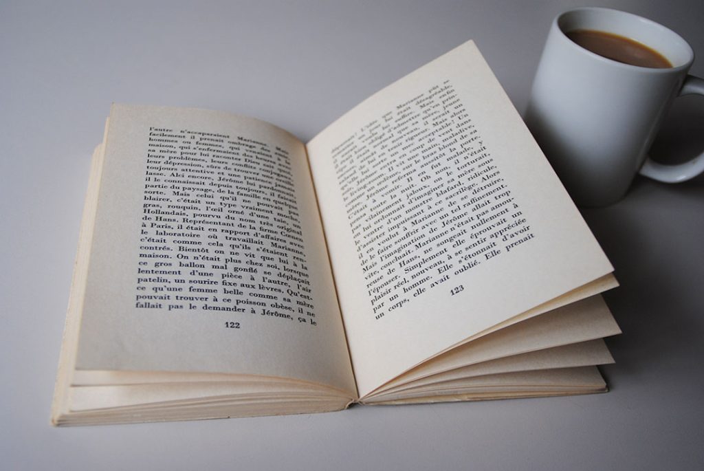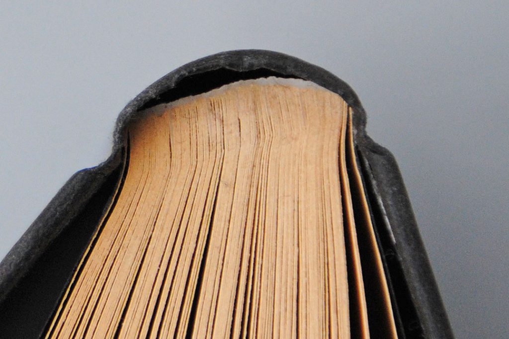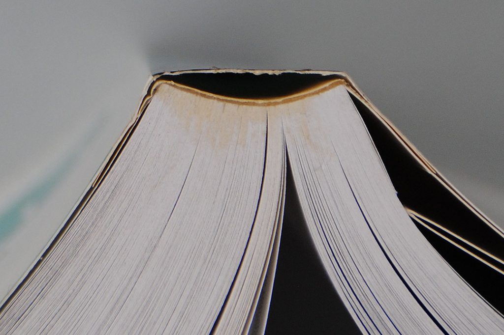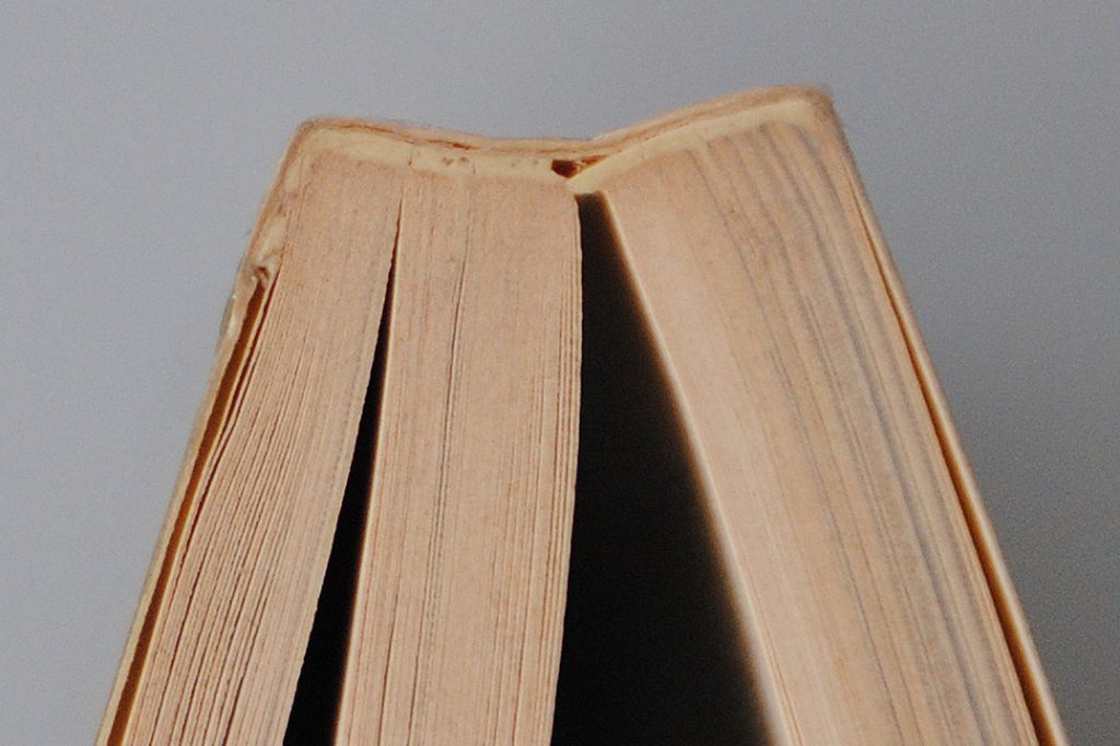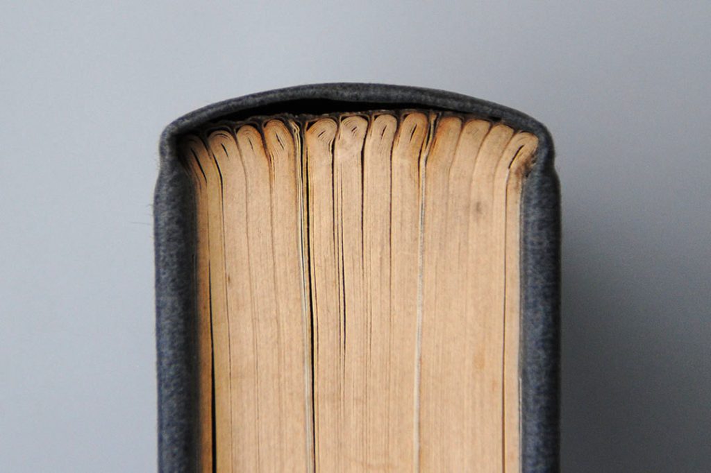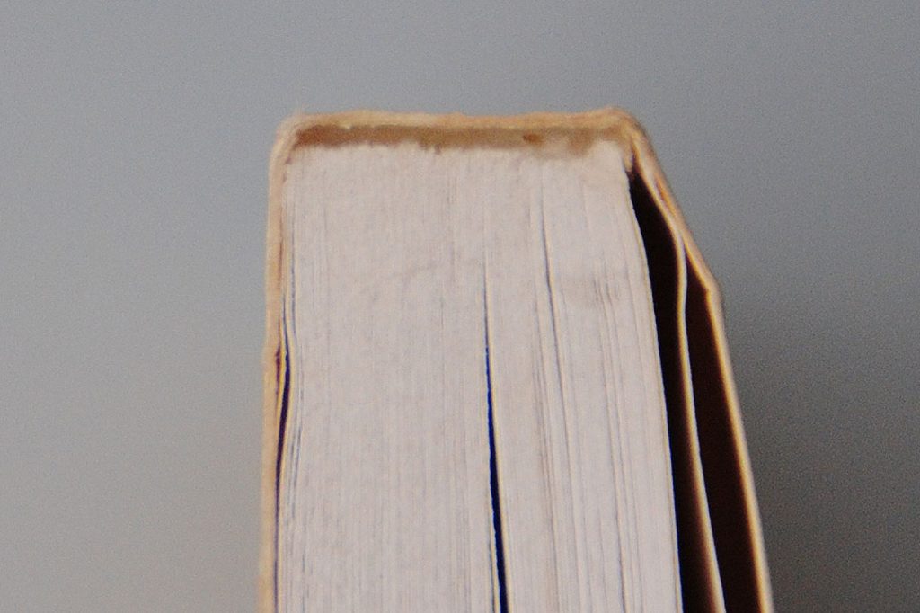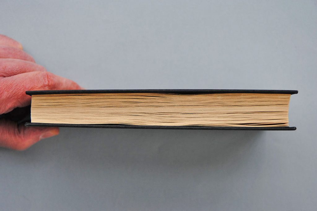 A book, when opened, should lie flat when placed on a table, and stay that way without help from its reader’s hands. It should open to its fullest extent, so that the whole of the page, or pair of pages, can be used: for photographs that might run into or across the central margins, for side-notes or other text that needs to occupy an inner margin. One might remark also that a book open on a table – while the reader holds a cup of tea in both hands (for warmth and comfort), or sews a button on a shirt, or carries a young child – is no more than a mark of decent civilization. So the binding should be strong enough to withstand this opening-out. The spine will of course begin to show signs of wear with this opening – that is in the nature of the materials – but it should not split, and the pages should not fall out.