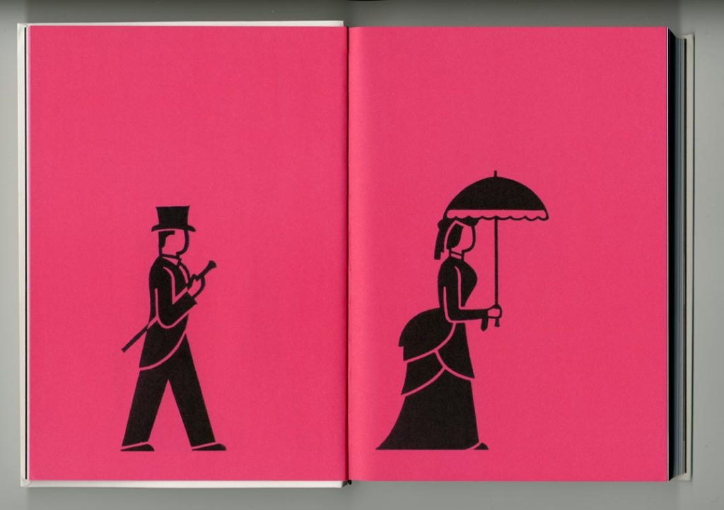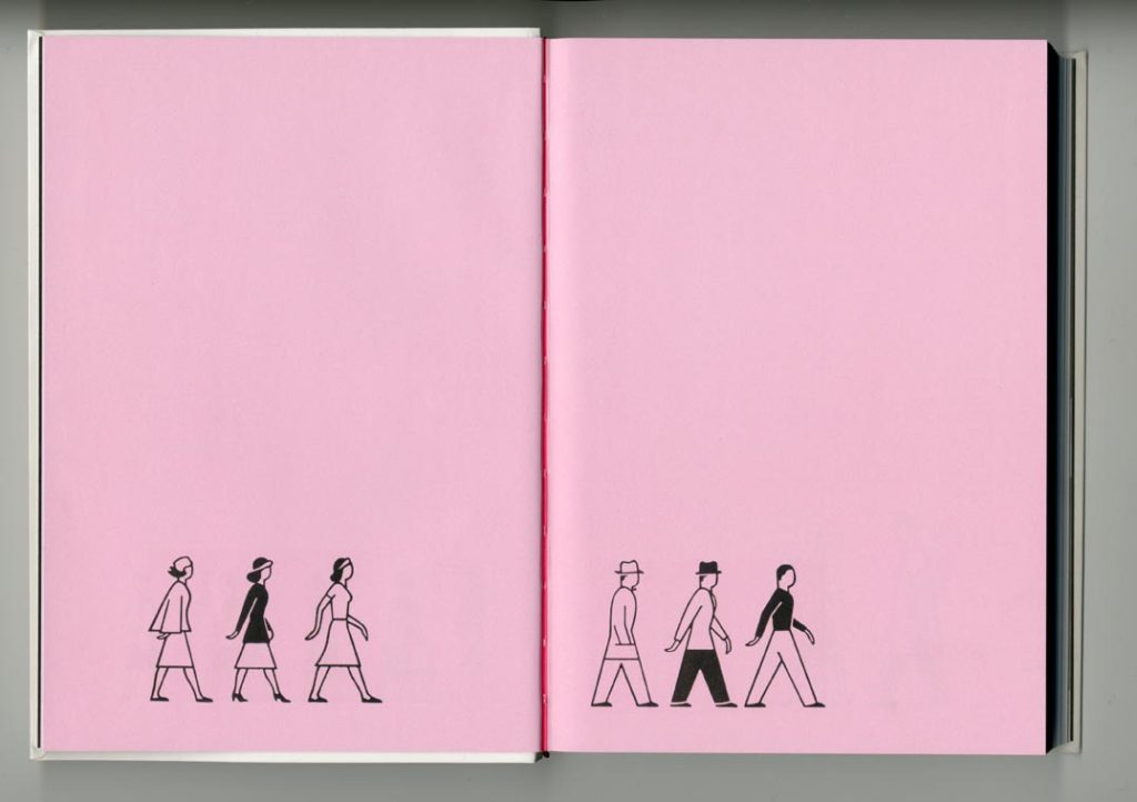 The book opens with a sequence of fourteen pages, each showing Arntz’s symbols. The effect of the sequence is cinematic and pretty: the background tint is intensified from light through to dark pink; the symbols increase in size (against Otto Neurath’s dictum of ‘repetition not increase in size’). One tries to find some meaning: does the sequence represent the passage of history? But there is no meaning here. It is just decoration. These opening pages already betray the spirit of the work they present.