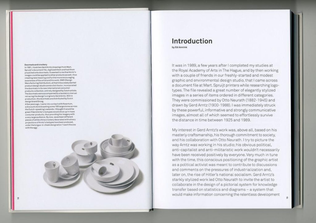 In his introduction, which opens on the facing page, Annink refers to Arntz’s ‘political, anti-capitalist’ work. The artist who in the 1920s aligned himself with the radical left in Germany and made strong analytical depictions of class society now finds, posthumously, his images turned into doormats and applied to the plates and cups of a discount store. There is a large historical irony at work here, but Annink shows no awareness of it.