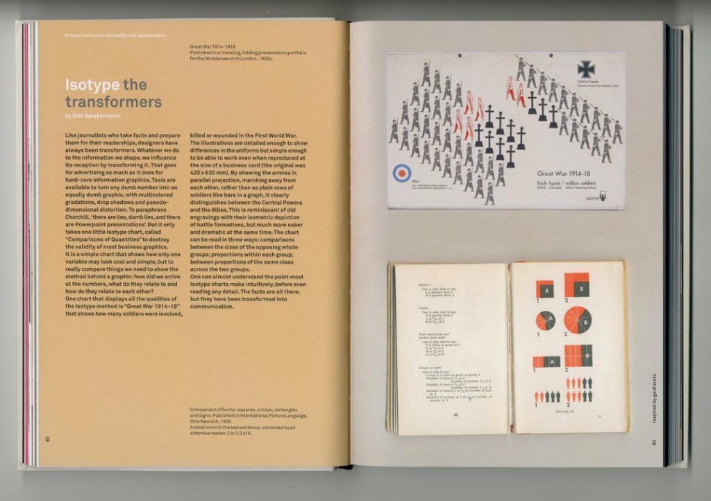 The one attempt here to consider configuration of material and transformation comes in the comments by Erik Spiekermann, writing about the ‘Great War 1914–18’ chart. These thoughts were first written in a book review published in Eye. Spiekermann restates my own discussion of this chart in the book he is reviewing, The transformer. Here the design of Annink and Bruinsma’s book lets him down: the big chart (42 × 63 cm) is shown the same size as the small format book International picture language (15 × 20 cm, when opened). This visual lie is enforced through placing them on the same background. Again, the designers of Gerd Arntz: graphic designer show themselves to have learned nothing from Isotype and its drive to truthful representation.