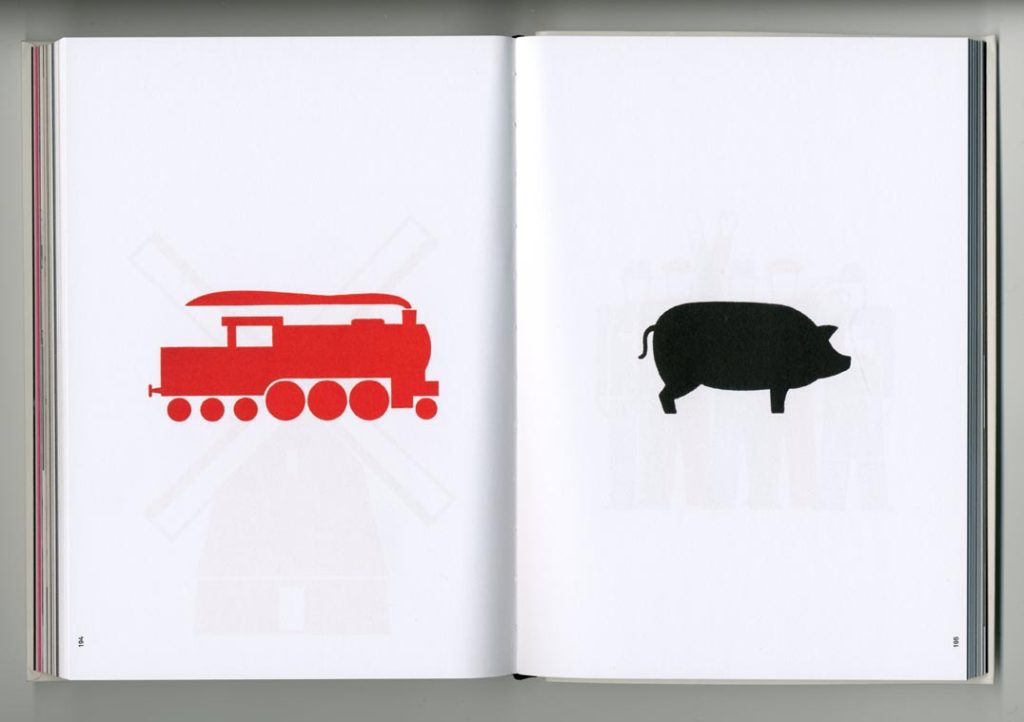 On page 18, in a note before the introduction, Ed Annink tells the story of an early use he made of Arntz’s symbols, already familiar from Lovely language (pp. 12–13). He took silhouettes (a hippo and a hare) drawn by Arntz, and got doormats made from them: ‘Still in production, the doormats are distributed by the Dutch design brand Droog.’ Another use followed: