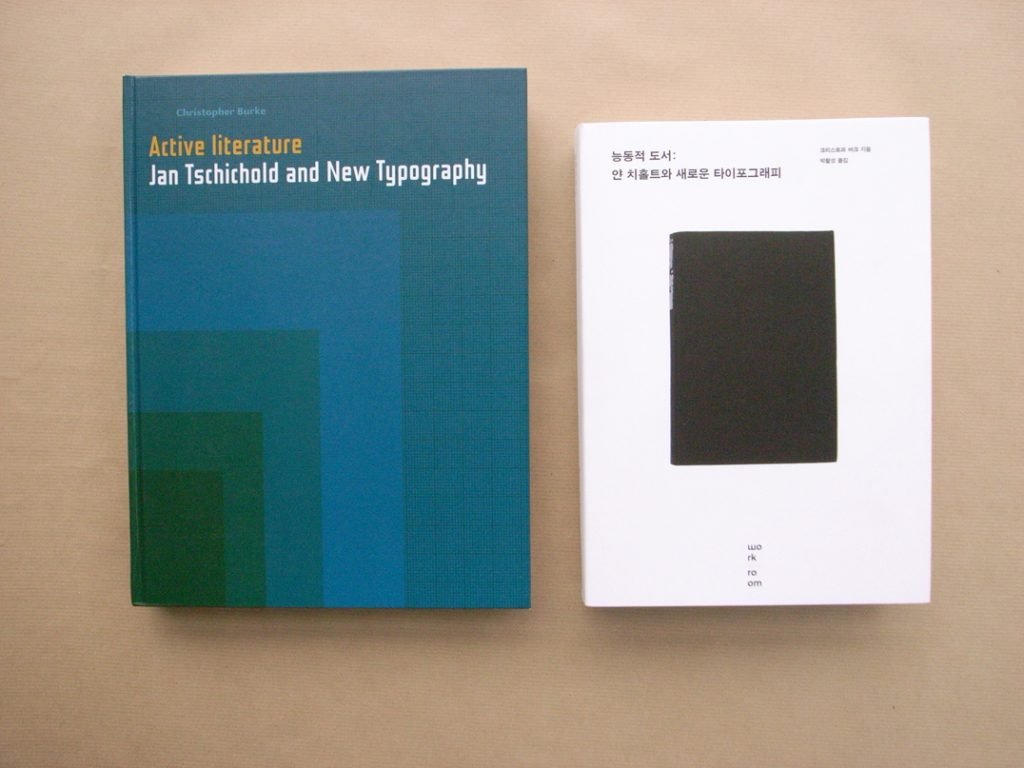 One of the most gratifying and interesting moments in book-publishing is seeing a book of ours issued by another publisher in a translated edition. It is not just the language that needs to be translated. As part of the publishing agreement, we will supply files for all the pictures: but the treatment of pictures remains in the hands of the other publisher. The size of pages, the paper, the binding, and all the other aspects of a book’s material composition are all open for determination by the translating publisher. All of which can provide a pleasant surprise. Often one may feel that the other publisher has refined or improved aspects of the material; or at least their resolution of the problems provides an illuminating alternative to what we did. This week copies of the Korean edition of Christopher Burke’s Active literature, published by Workroom Press in Seoul, arrived here in London.