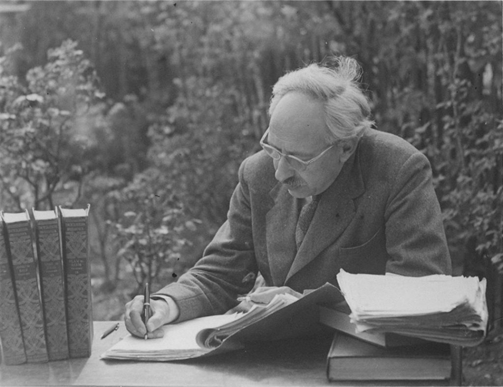 E.C. Large in 1956, at work on his last novel, Dawn in Andromeda, in the garden of his home.