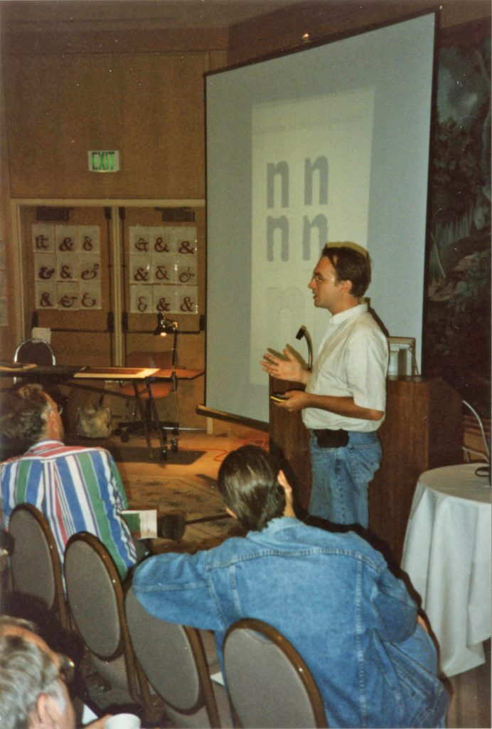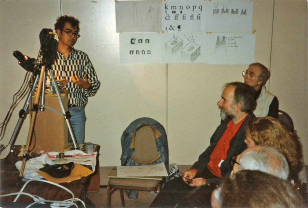 This was part of the process leading up to the publication of Fred’s book Counterpunch. And we included grabs from some of the video recordings as illustrations in the book. We had already announced Counterpunch in 1993, with a printed leaflet for the Antwerp meeting of that year. After San Francisco, another two years passed before we were able to launch the book at the ATypI meeting in The Hague, 1996. Finished copies were ready just hours before we could present it at that year’s TypeLab, with a seminar discussion that featured a number of Fred’s colleagues on the panel.