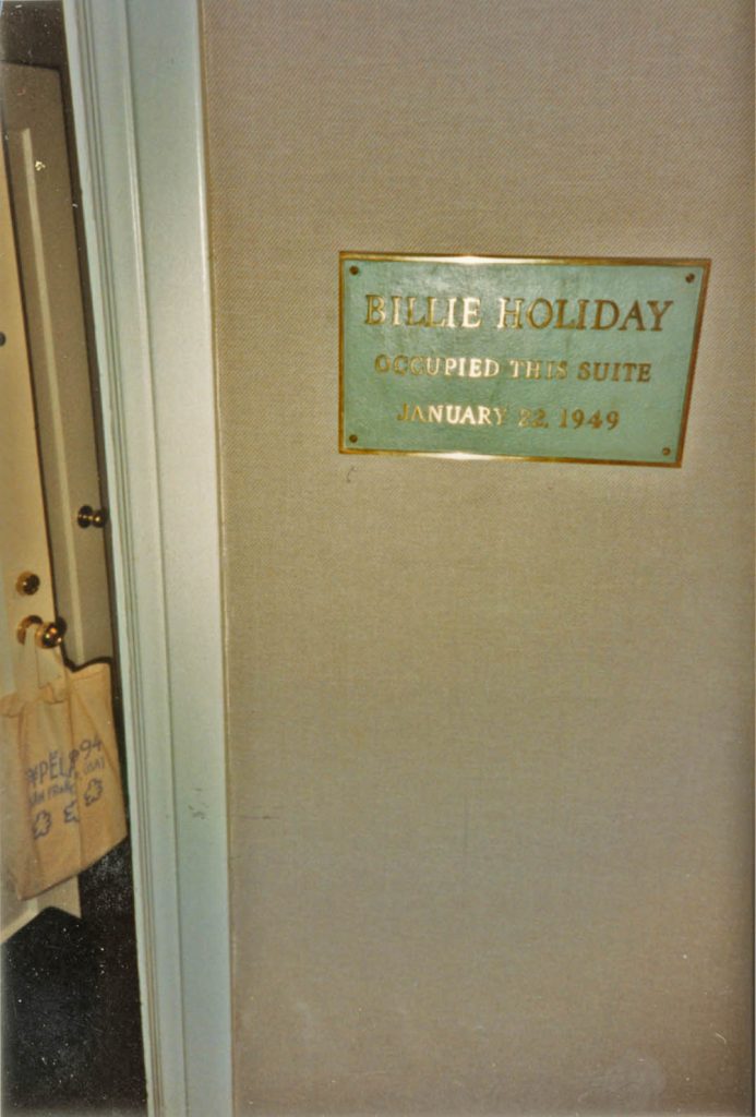 My room at the Hotel Mark Twain: on the door handle, an ATypI conference bag. And on the wall outside the room is a plaque that commemorates the event there of 22 January 1949, when Billie Holiday was arrested on a drugs charge.