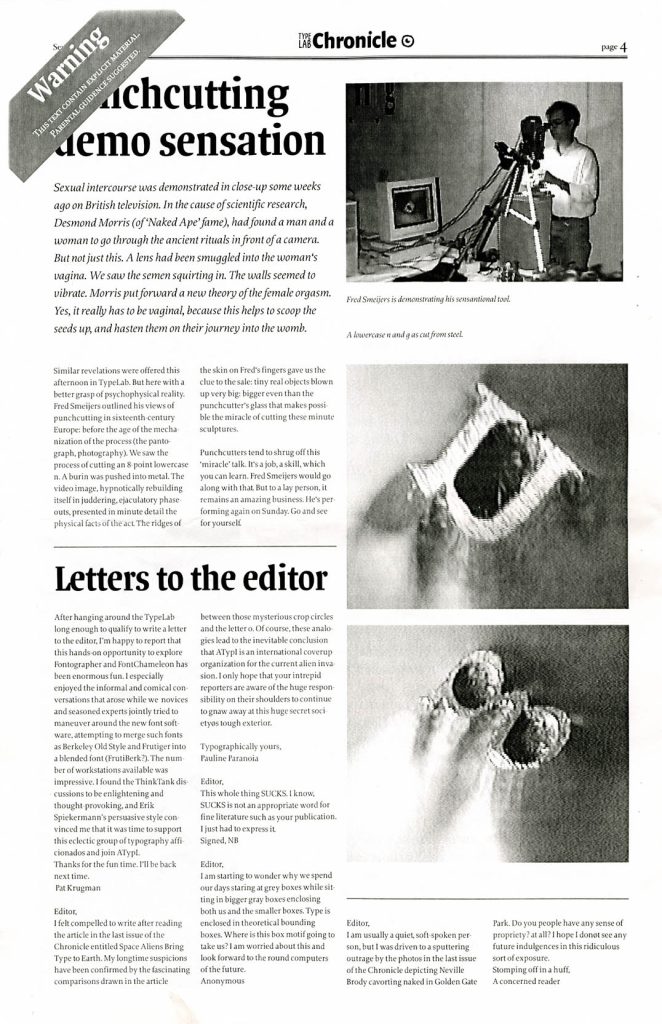 Photographs of the punchcutting process are common enough, but certainly I had never seen the work recorded on film at such magnification. I wrote a rapid report of it for the TypeLab Chronicle, in a style that borrowed something from tabloid journalism.