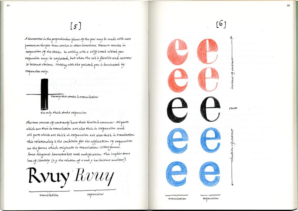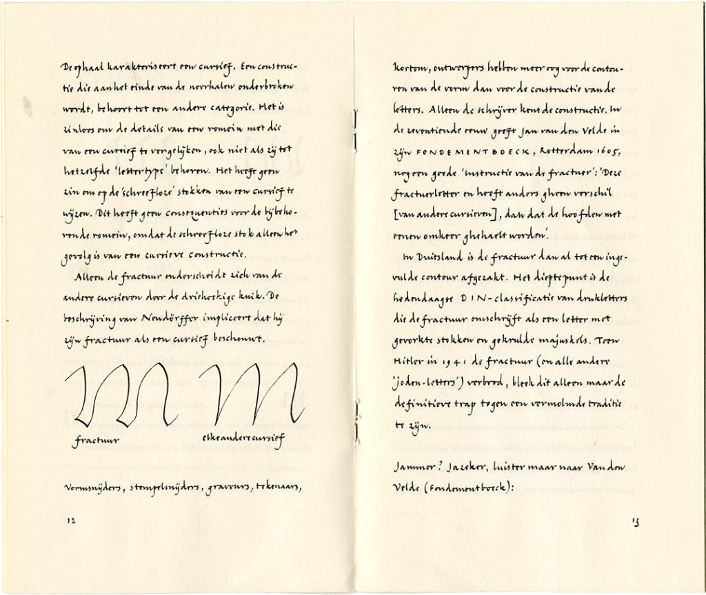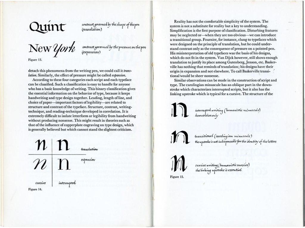 In these student years at Reading, some of us could not get enough typography. One of our extra-curricular efforts, in which Paul Stiff and I were the main movers, was a seminar discussion of writings on the subject. We gave some sessions to Gerrit’s first published discussion, ‘Broken scripts and the classification of typefaces’, published in the Journal of Typographic Research in 1970. (On a visit to Reading, the journal’s editor, Merald Wrolstad, had given any student who wanted it a set of back numbers.) Setting out as a book review, the essay becomes an exposition of Gerrit’s theory of writing and of letters, and we are introduced to the first published version of his binary divisions: translation (writing with a broad-nibbed pen) / expansion (writing with a flexing nib), and cursive (the pen is not lifted from the writing surface; in his English-language expositions this was then changed to running, from the Dutch lopend) / interrupted (the pen is lifted). As Gerrit would explain, this scheme might not be exhaustive, and one could produce and observe letters that mixed these categories. But this is a secure framework with which to generate letters and letterforms. It gives any student a foundation. It is a way of thinking that is on the side of the designer: it will help us in production. And, incidentally it will demolish after-the-event historians who will generate endless historical or formal or historical-formal categories to describe letters. Gerrit loved to oppose Stanley Morison and his acolytes, as being not much more than antiquarian collectors. (From another direction, but with the same intention, Anthony Froshaug suggested that Morison was the Stanley Gibbons of typography.)
