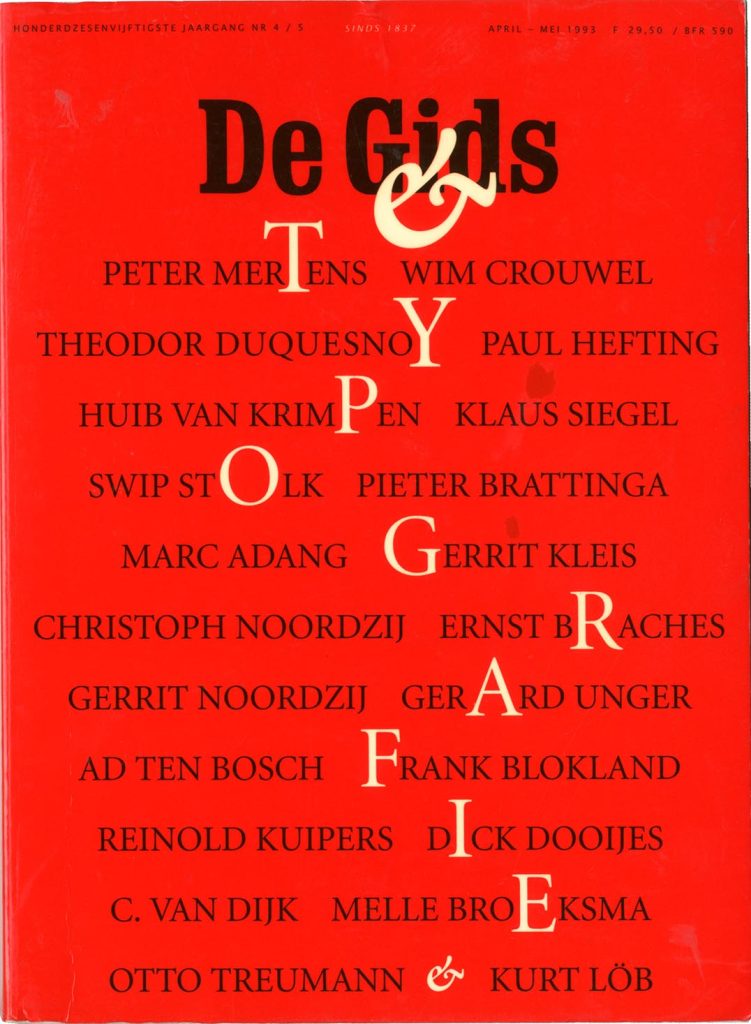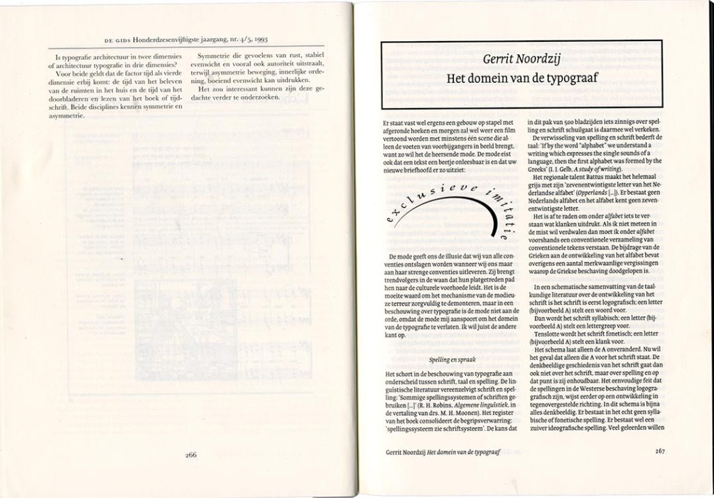 But in his own writings, he wanted to do it all himself: edit his own text, write or typeset it, make it into pages. This was the lesson of our hopeless attempt to be his editor for Letterletter. In the article that he contributed to a special typography issue of De Gids, Gerrit was indulged by the editors: his piece ‘Het domein van de typograaf’ was set by the author in his own typeface. It stands out, isolated, and without visible connection to the rest of the publication. With one exception (Frank Blokland’s article) all the other typographer-authors were given the journal’s standard treatment. Gerrit’s pages were certainly more sharply designed than those of the rest of the journal. But this seems a sad state of affairs: a writer disconnected, and refusing to share in the common exchange of views and information.