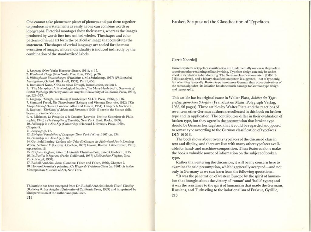 Gerrit’s second published exposition of these ideas came in ATypI’s Dossier A–Z, edited primarily by Fernand Baudin and published in 1973. Contributors were asked to provide their own artwork for the pages, and they included a group of us Reading students with a statement on the value of studying historic letterforms. (We were democratically given this space by our teacher Michael Twyman: this was the 1970s.) Gerrit wrote out the text and drew diagrams for his own pages. This was perhaps the first instance of what became his method of publication, in which he wrote down the words himself; later, with his personal computers, he would be the compositor.