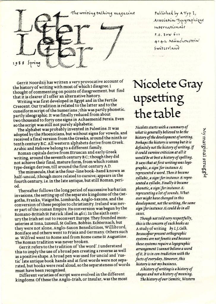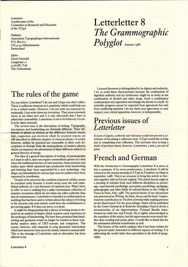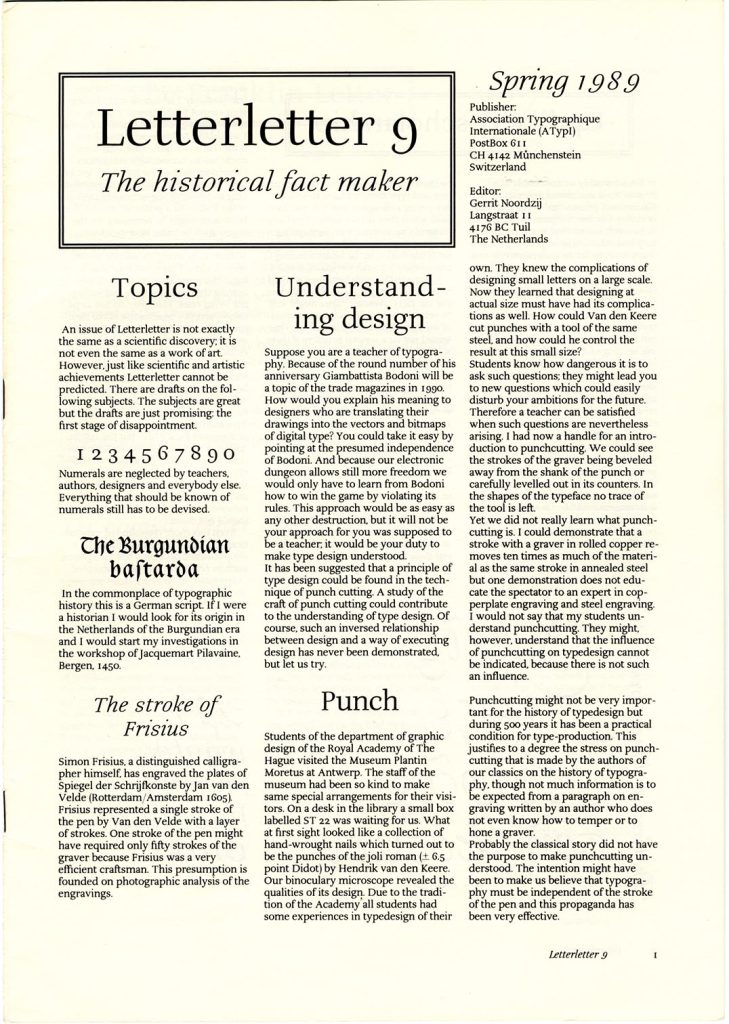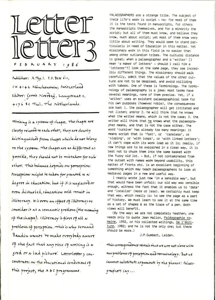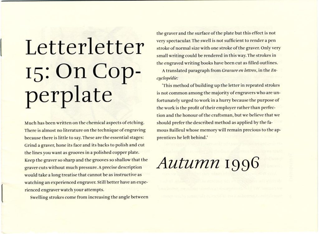 Following a week-long trip to the Netherlands in 1991, I began to get to know the Dutch typographers and type designers. Then in 1992, Paul Stiff and I were among those attending another ATypI education seminar, this time at Budapest. For Paul especially this was memorable for his conversations with Gerrit and Wilme Noordzij. In July 1993, following their Budapest discussions, Peter Matthias Noordzij, then beginning to develop his Enschedé Font Foundry, wrote to Paul and myself suggesting that we might take over the editorship of Letterletter, which was now being published by TEFF. Peter Matthias wanted to widen out the bulletin, with contributions from others. Until then Letterletter had been almost entirely written by Gerrit, with others – primarily Nicolete Gray and Fernand Baudin – occasionally sending communications for its pages; these external contributions were qualified by introductory remarks by the editor.