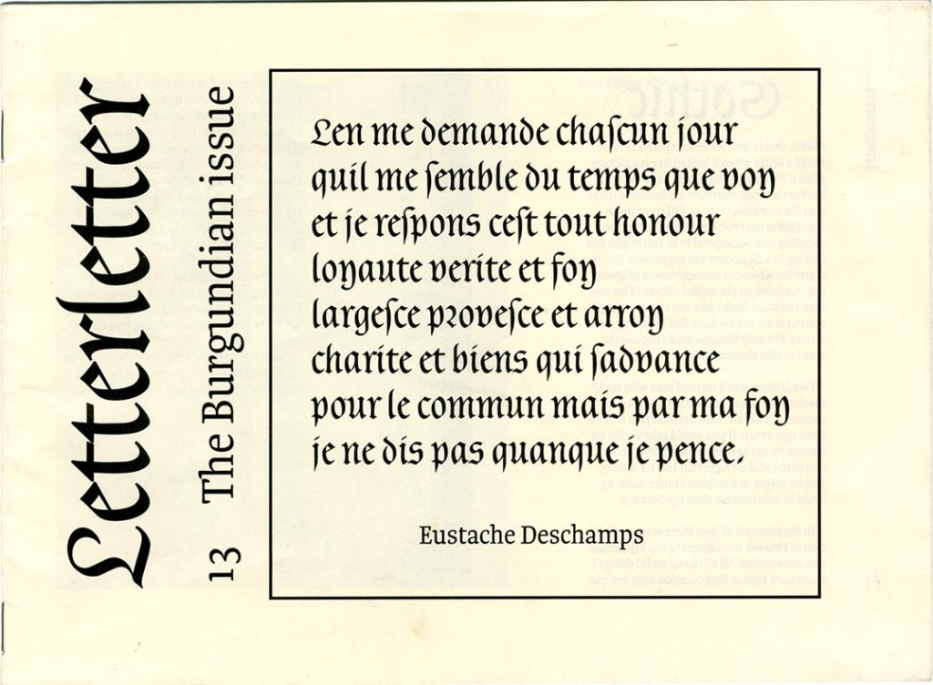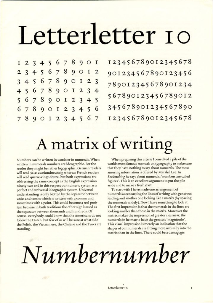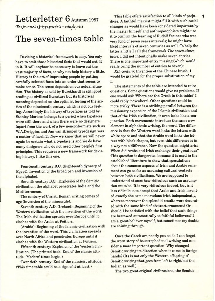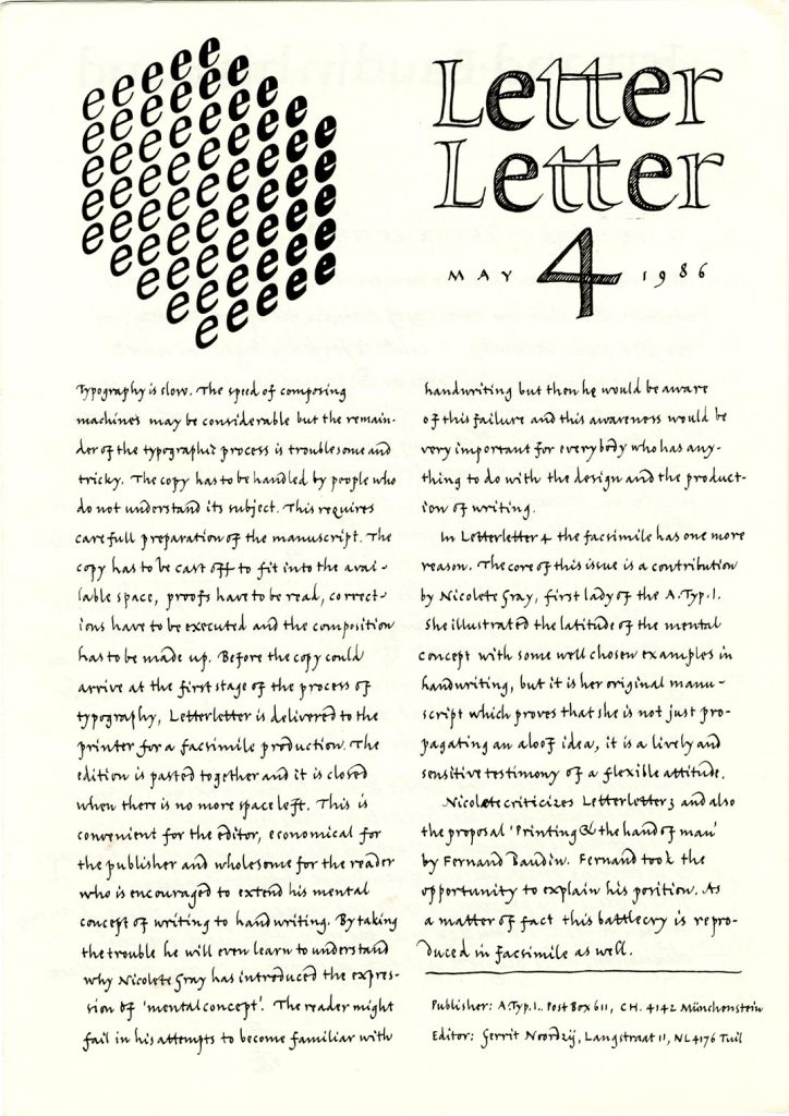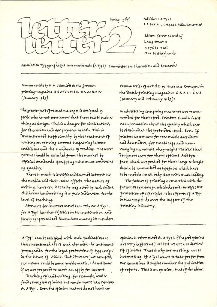 Following a week-long trip to the Netherlands in 1991, I began to get to know the Dutch typographers and type designers. Then in 1992, Paul Stiff and I were among those attending another ATypI education seminar, this time at Budapest. For Paul especially this was memorable for his conversations with Gerrit and Wilme Noordzij. In July 1993, following their Budapest discussions, Peter Matthias Noordzij, then beginning to develop his Enschedé Font Foundry, wrote to Paul and myself suggesting that we might take over the editorship of Letterletter, which was now being published by TEFF. Peter Matthias wanted to widen out the bulletin, with contributions from others. Until then Letterletter had been almost entirely written by Gerrit, with others – primarily Nicolete Gray and Fernand Baudin – occasionally sending communications for its pages; these external contributions were qualified by introductory remarks by the editor.
