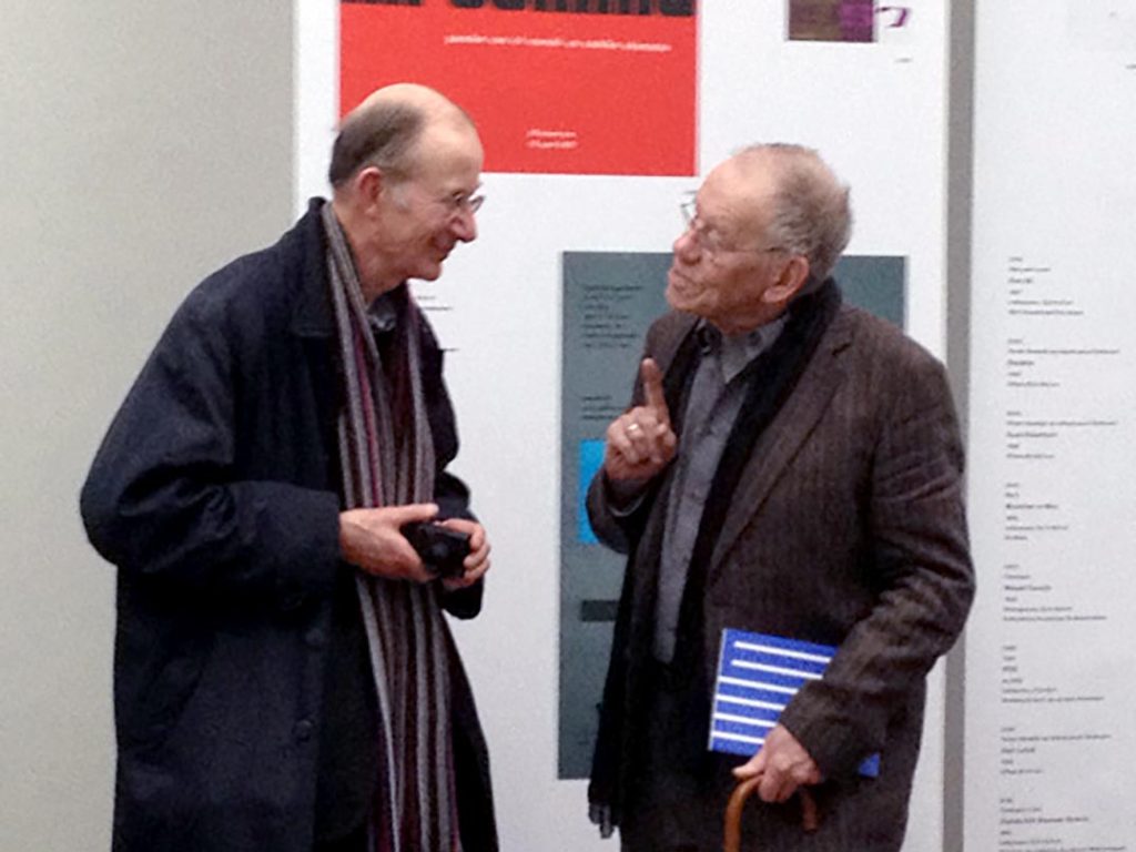 Trying to get a word in, at the opening of the Wim Crouwel Exhibition, Gerrit Noordzij prize 2012, 9 March 2012 at the KABK. (Photo: Jo De Baerdemaeker.)