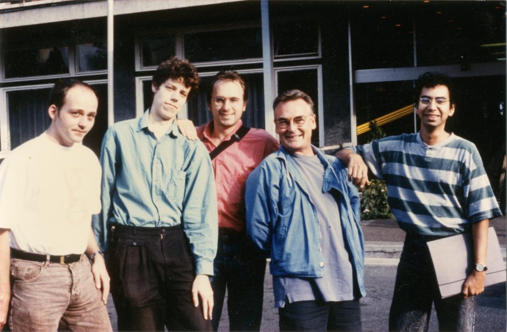 Typographers in Budapest, 1992. Above: Peter Verheul, Just van Rossum, Martin Majoor, Paul Stiff, Fred Smeijers. Below: GN, RK. (Photographer: unknown.)