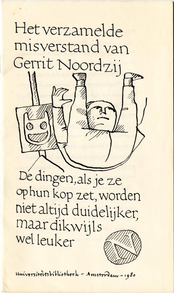 Het verzamelde misverstand van Gerrit Noordzij, Amsterdam: Universiteitsbibliotheek, 1980 (210 x 125 mm). ‘The collected misunderstandings of Gerrit Noordzij: things that, when you put them on their heads, don’t always become clearer, but often become much nicer’: a 24-page pamphlet of miscellaneous writings, presumably published on the occasion of an exhibition at the UB.