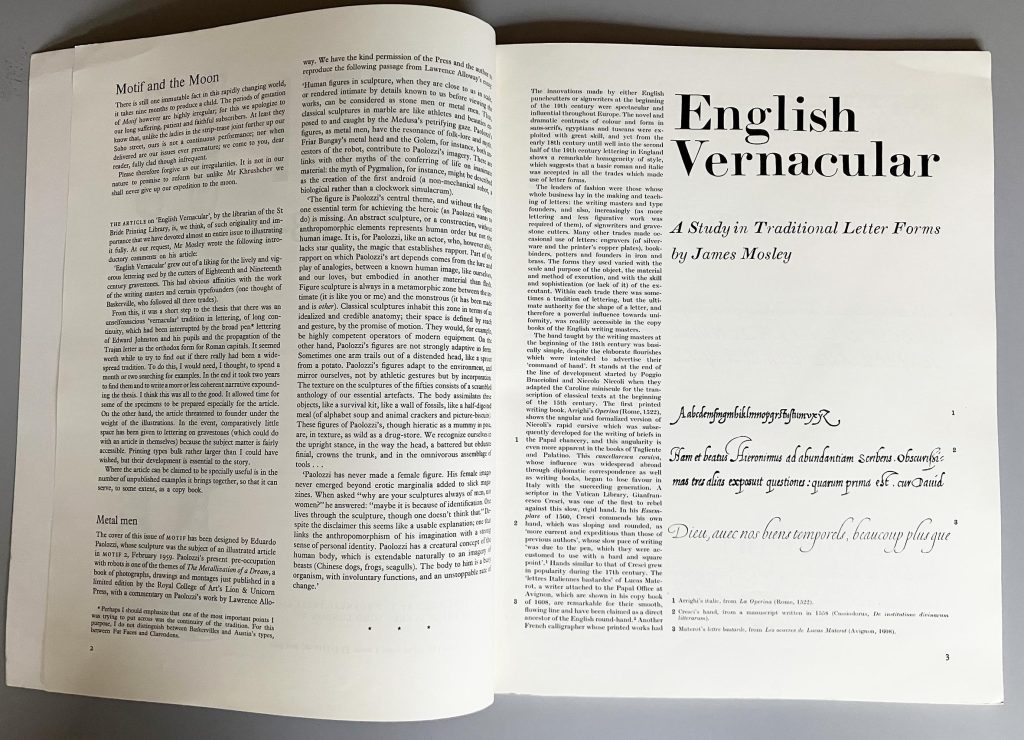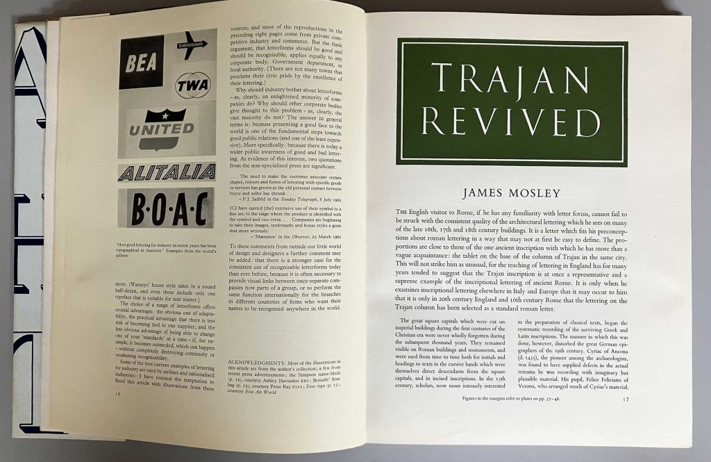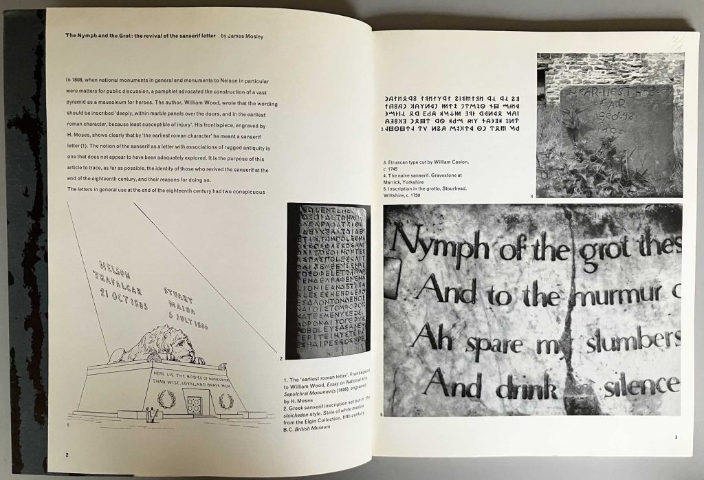 As a writer, James burst into the public world of typography in the mid-1960s with three substantial articles: ‘English vernacular: a study in traditional letterforms’ (Motif, no. 11, 1963), ‘Trajan revived’ (Alphabet, no. 1, 1964), ‘The nymph and the grot: the revival of the sanserif letter’ (Typographica, new series no. 12, 1965). These essays were both academically secure, but were written in plain and accessible prose that could reach anyone who was interested. They were also very well illustrated, with photographs by the author himself prominent among these pictures. The publishers of the three journals exemplified the indivisiblity of practice and theory in thinking about typography and letterforms. Each was published by an English printing firm priding itself on its high standards of design and production: Shenval Press in London (Motif), Kynoch Press in Birmingham (Alphabet), and Lund Humphries in Bradford and London (Typographica).4 Such cultural generosity from commercial firms is hard to imagine now.