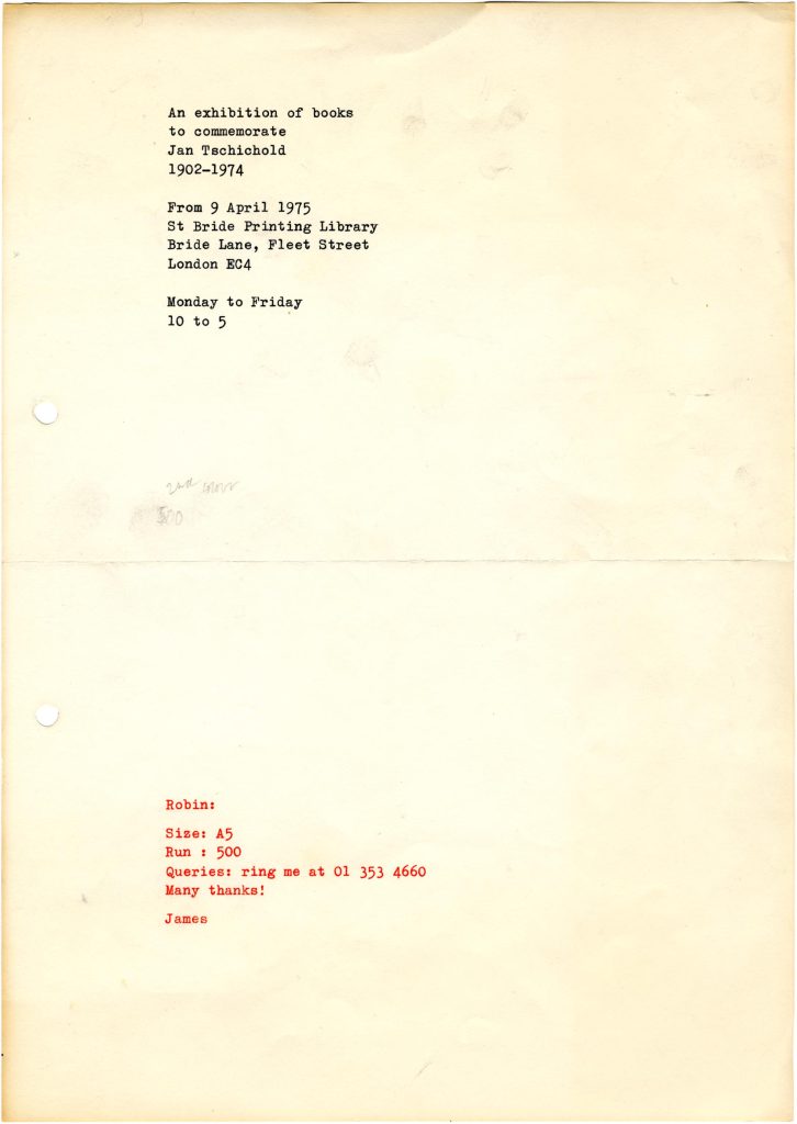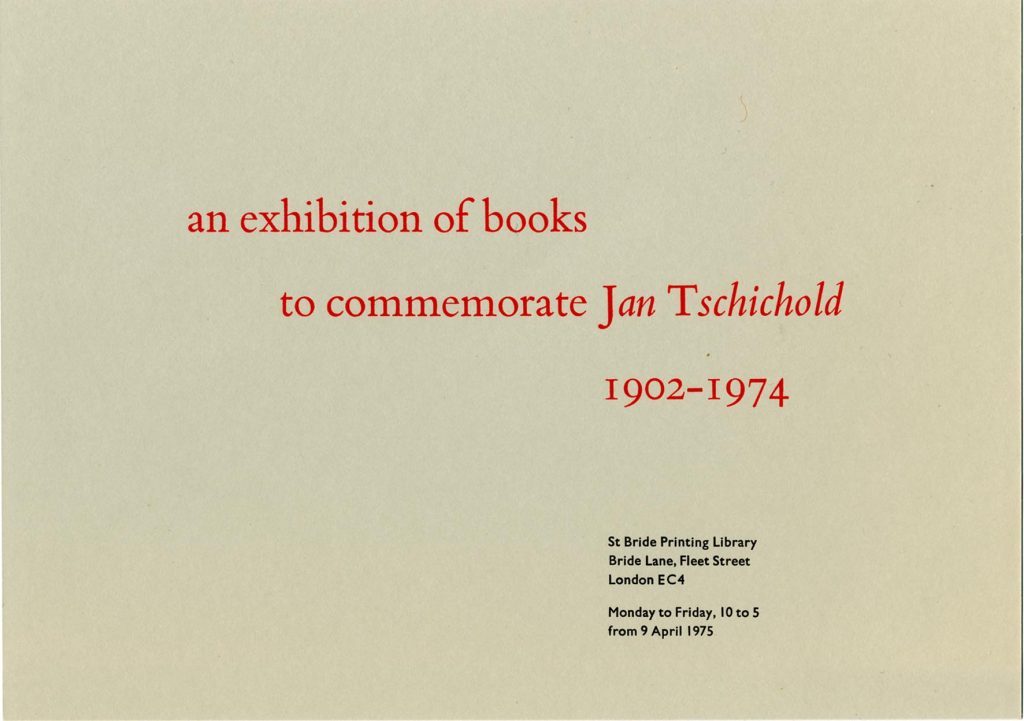 In 1975 the St Bride Library put on a display of the work of Jan Tschichold, who had died the year before and who was being celebrated in a book written by Ruari McLean. The job of designing a notice for the exhibition was given to me, then in my final undergraduate year; I did the typesetting, though not the printing. I had become preoccupied with Tschichold, teaching myself German to read his writings. Further, I had fallen under the spell of his sharpest English interpreter, Anthony Froshaug, becoming more of a Froshaugian than a Tschicholdian.5