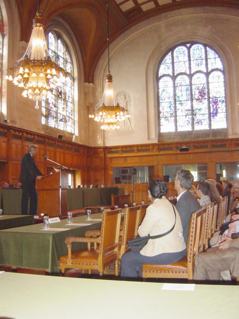 Another special occasion was a visit to the Vredespaleis in The Hague, seat of the International Court of Justice. Sitting in the main chamber, the front row of desks bearing signs saying ‘Argentina’ and ‘Uruguay’, ready for next day’s hearing of an action about pulp mills on the River Uruguay, we were addressed by Jeroen Vervliet, librarian of the Vredespaleis, and by Arthur Eyffinger, who gave a high-speed improvised discourse on the birth of this institution, donated to the city of The Hague by Andrew Carnegie. For this listener, Eyffinger’s talk was overshadowed by its beautifully preserved surroundings.