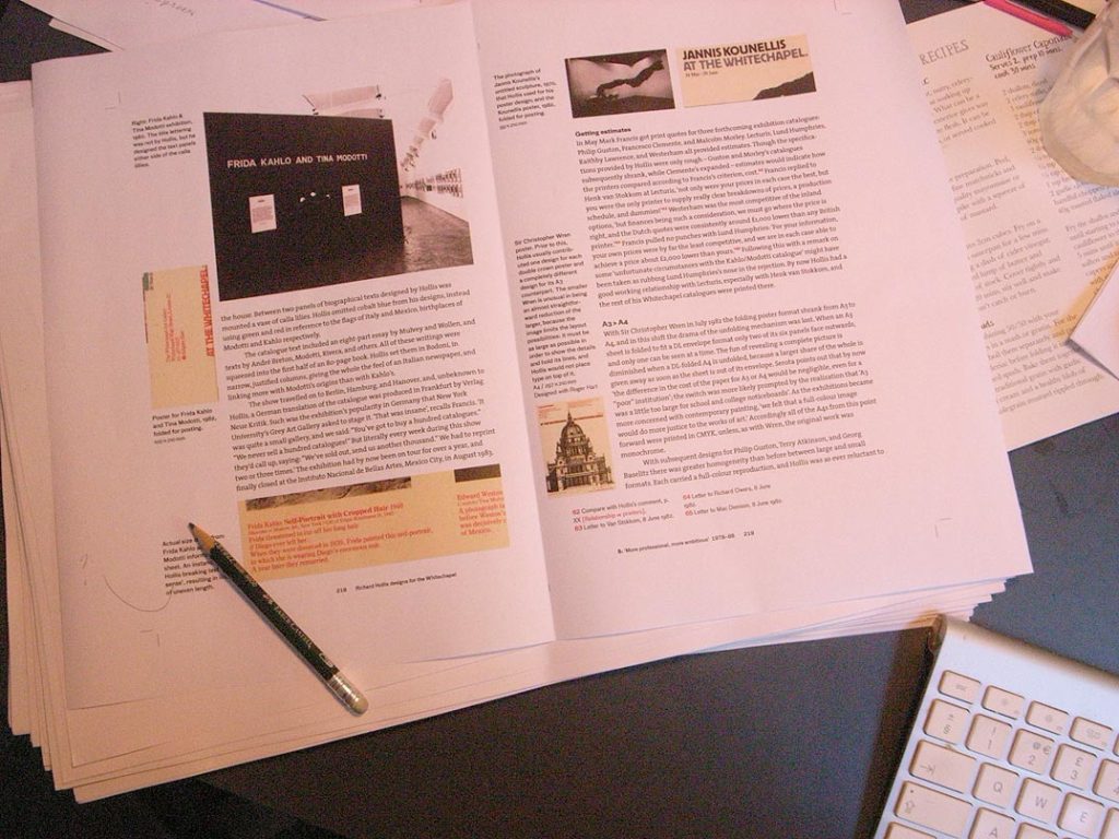 Our Richard Hollis designs for the Whitechapel is perhaps the most anticipated, most delayed work on which we have worked. Christopher Wilson’s book was first announced to the world in November 2012, as due for publication in spring 2013. Since then the work has grown and become elaborated. It is, in part, an experiment in how to discuss graphic design, without any obvious precedent. The author is also the designer, image processor, and page-maker. This concentration of labour in the hands of one person makes the experiment possible, though it also requires a Stakhanovite commitment. The book – main text, notes, pictures, short captions, extended narrative captions, cross-references, appendixes, bibliography, and more – is now done, and we are working on the index; a final proof-reading will follow. With the printer there will be tests for printing pictures on the chosen paper. The binder will make a dummy, and the glueing of the book-block will be tested. We expect to go into material production in January and to publish in April 2017. Your patience is certainly appreciated here.