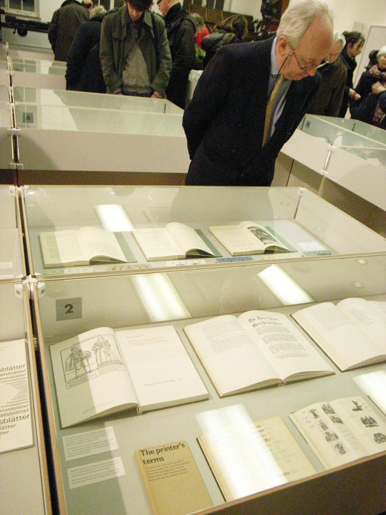The exhibition was opened last Thursday with Jost Hochuli’s presentation of the topic – a wide-ranging history of book-making in St Gallen. A set of demountable cases came from Switzerland as part of the exhibition. The Library’s own cases have been removed to accommodate this. This familiar exhibition room has, for the moment, a surprisingly different feel.