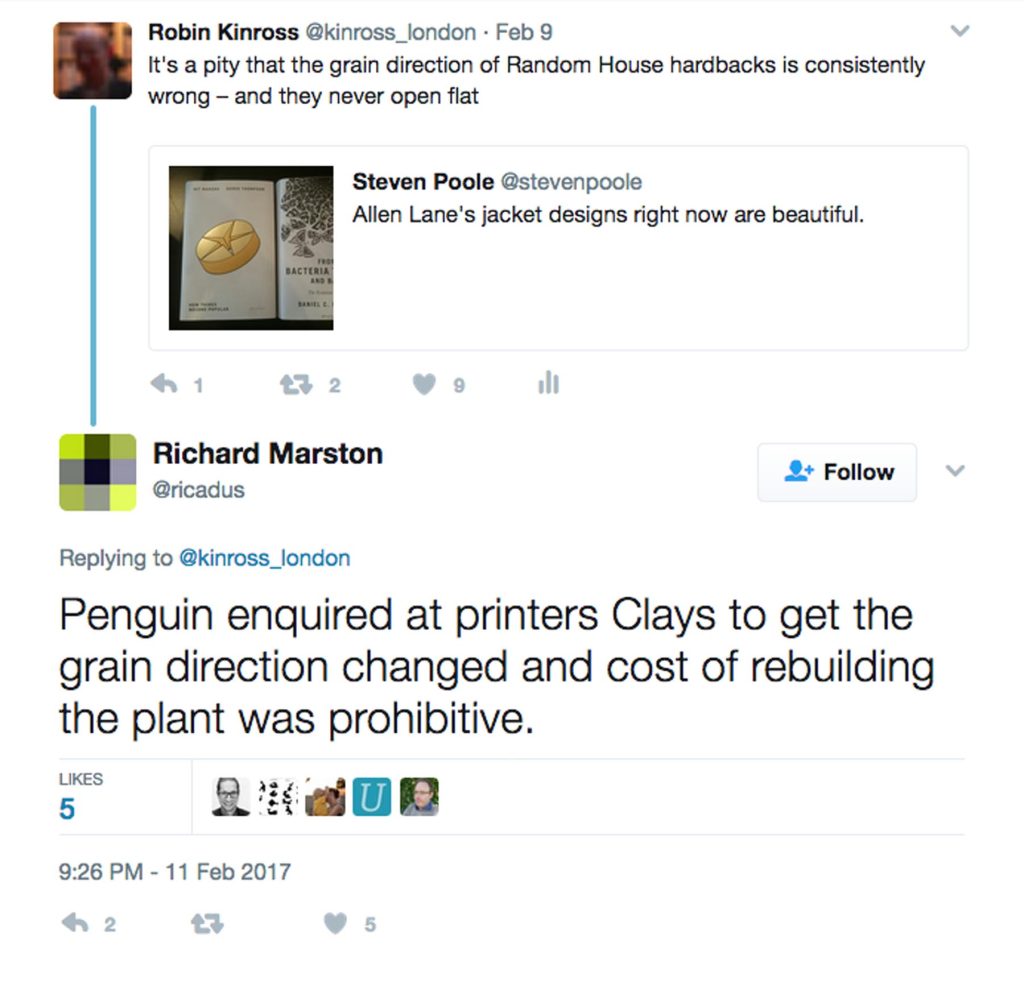So instead of waiting eighteen months for the paperback to appear (at least its grain direction would be OK), I bought the book. Already in the shop, the colophon gave the explanation: