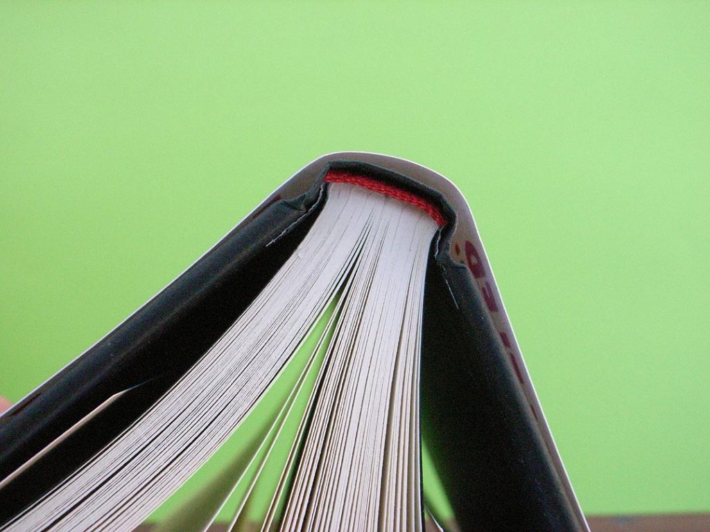 First: the sections are glued with polymer (rather than water-based) adhesive. This is why the book will not lie flat when first opened: only a water-based, cold-glue process will allow decent opening. Cold-glue is not now available in UK industrial book production, so if a book has to be produced in the UK, then this superior process is simply not available to a production manager.