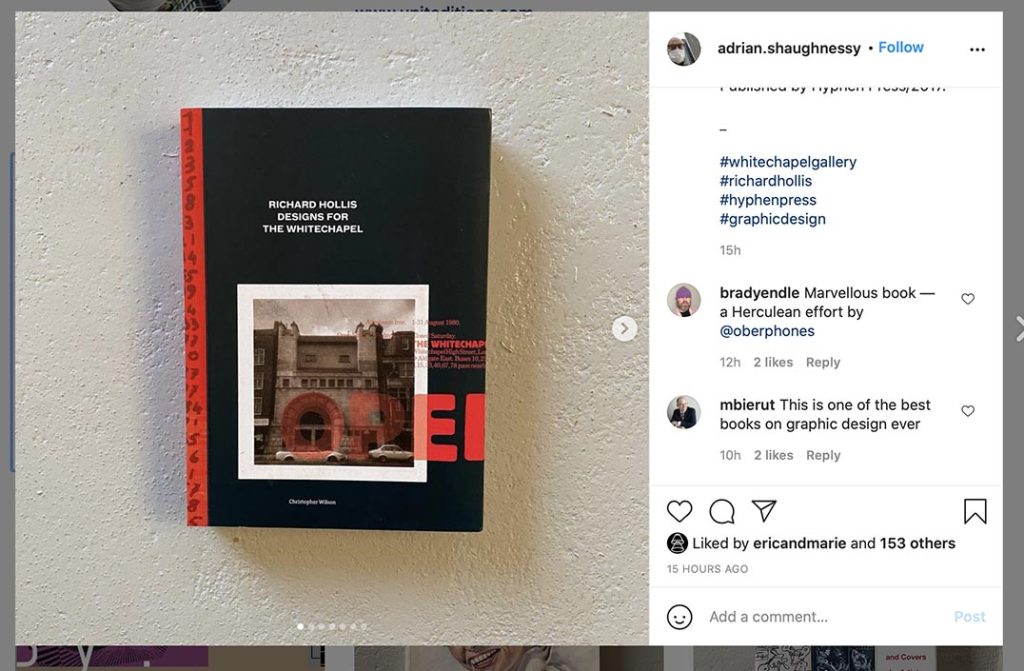 We agree with Michael Bierut, a serious reader and judge of graphic design books. He made this comment yesterday on the Instagram feed of Adrian Shaughnessy (another serious reader and judge of graphic design books). Earlier, in November 2019, Bierut had praised this book in a Design Observer podcast, rightly pointing to its special flavour as both design scholarship and design journalism. ‘It is just enthralling’, he said. In the podcast, Bierut tells how he found the book by personal recommendation – which is how so many books are sold and bought.