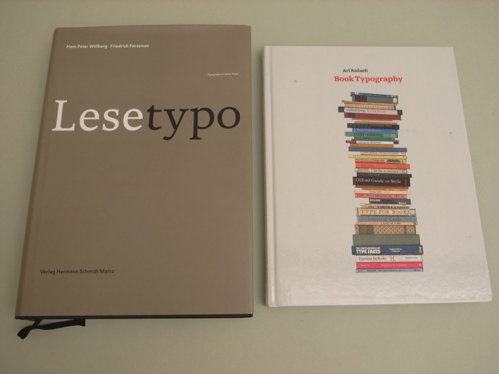 Rafaeli’s Book typography offers a contrast to Willberg & Forssman. The book comes without a subtitle, but a kind publisher might have suggested ‘a book of personal tastes and views’ (the words of the author in his preface) and so would have warned us of the nature of this strange work. Rafaeli has written what is essentially an essay, picking out topics within the field of ‘typography for reading’ that interest him. The book opens with a twenty-page consideration of the virtues of close word-spacing and how this may be achieved. He discusses settings in QuarkXPress and InDesign, and so goes some way to providing a practical manual. The discussion proceeds to ‘Mise-en-page etc.’, then to an interlude on two recent books by authors in the same Anglo-American tradition (Richard Hendel and Robert Bringhurst), followed by ‘Points of style’ (on what is called ‘house style’), and in conclusion ‘Type for books’ – on suitable typefaces, treated one by one.