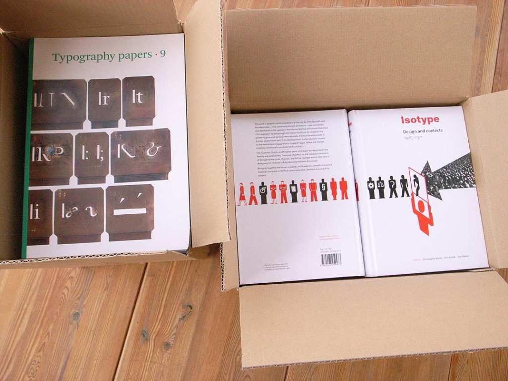 Copies of our two new titles arrived in the office recently, and we are releasing them for sale today. These are Typography papers 9, edited by Eric Kindel and Paul Luna, and Isotype: design and contexts, 1925–1971, edited by Christopher Burke, Eric Kindel, and Sue Walker. Both books are collaborations with the Department of Typography at the University of Reading; the second book being an outcome of the Isotype revisited project there. Both books have been well printed by Die Keure in Bruges. Both have been well finished and bound (using cold glue) by, respectively, Sepeli in Evergem and Callenbach in Nijkerk. For some people the binding alone will make them worth getting hold of. For others the extraordinarily rich content will be the main reason for acquisition.